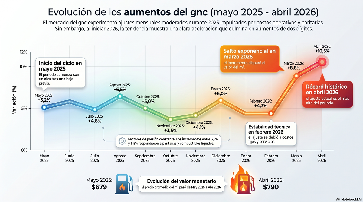 Este nuevo salto llega apenas un mes después de la última actualización de precio. Se había mantenido sin cambios desde el pasado 20 de marzo, cuando el m³ de GNC pasó de $679 a $739. Aquel ajuste también estuvo impulsado por la volatilidad internacional del crudo y su impacto en las naftas locales.