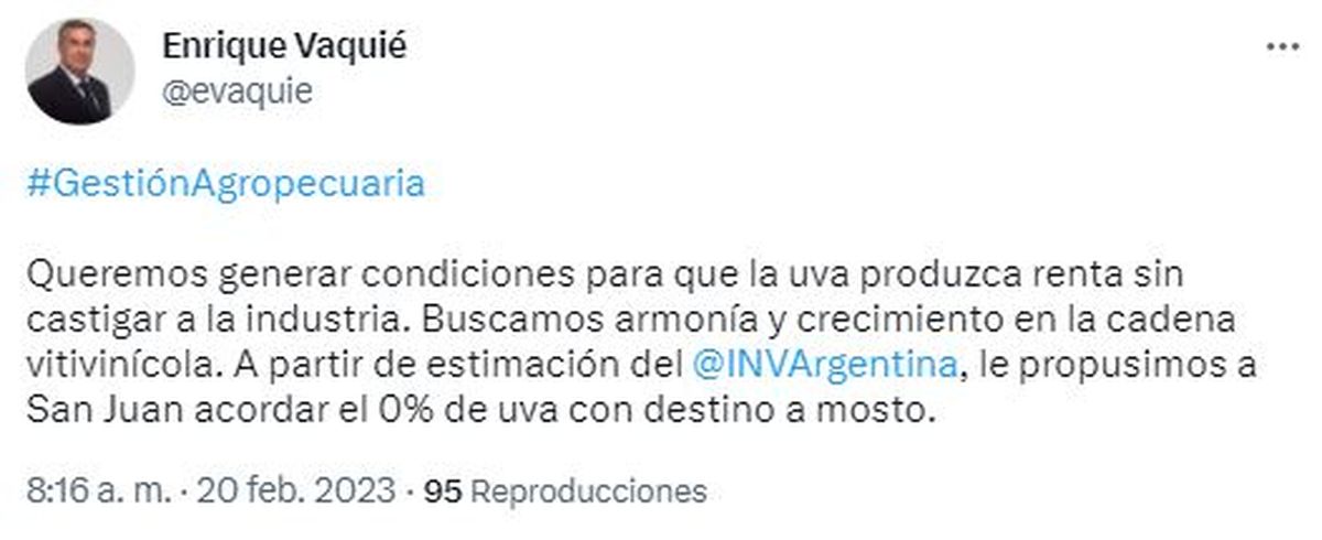 El Gobierno de la Provincia solicitará que este año no se destine vino a mosto. Esto es en el marco del conocido acuerdo entre Mendoza y San Juan, por el que se busca mantener un equilibrio en los stocks destinando parte del vino a mosto y a otros subproductos. El Ministro de economía Enrique Vaquié dijo que "le propusimos a San Juan acordar el 0% de uva con destino a mosto".