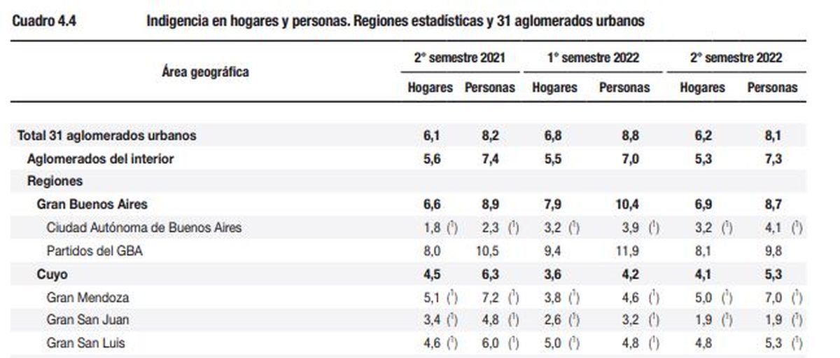 El porcentaje nacional muestra que el 40,7% es pobre y el 7,9% es indigente. Para el Gran Mendoza las cifras son similares: el 41,7% es pobre y el 7% es indigente. Es decir, hay más pobres pero menos indigentes.