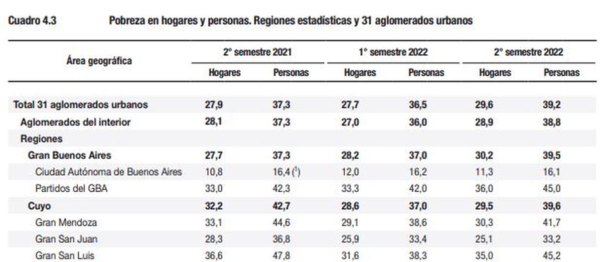 En el segundo semestre de 2021, había 44,6% de pobres, en el primer semestre de 2022, bajó a 38,6% y en el último informe subió a 41,7%.
