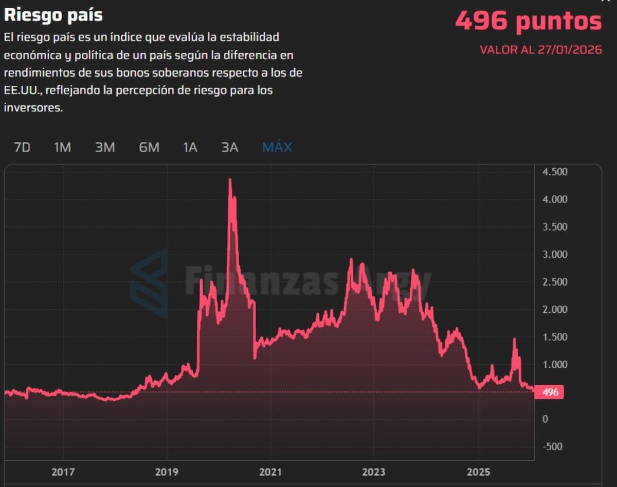 El riesgo país perforó finalmente este martes los 500 puntos, y se ubicó en 496, por primera vez en casi 8 años.