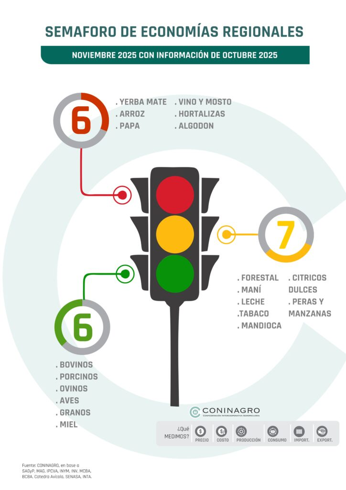 Con todo, las luces muestran que los 6 sectores que siguen en rojo son yerba mate, arroz, papa, vino y mosto, hortalizas, y algodón.