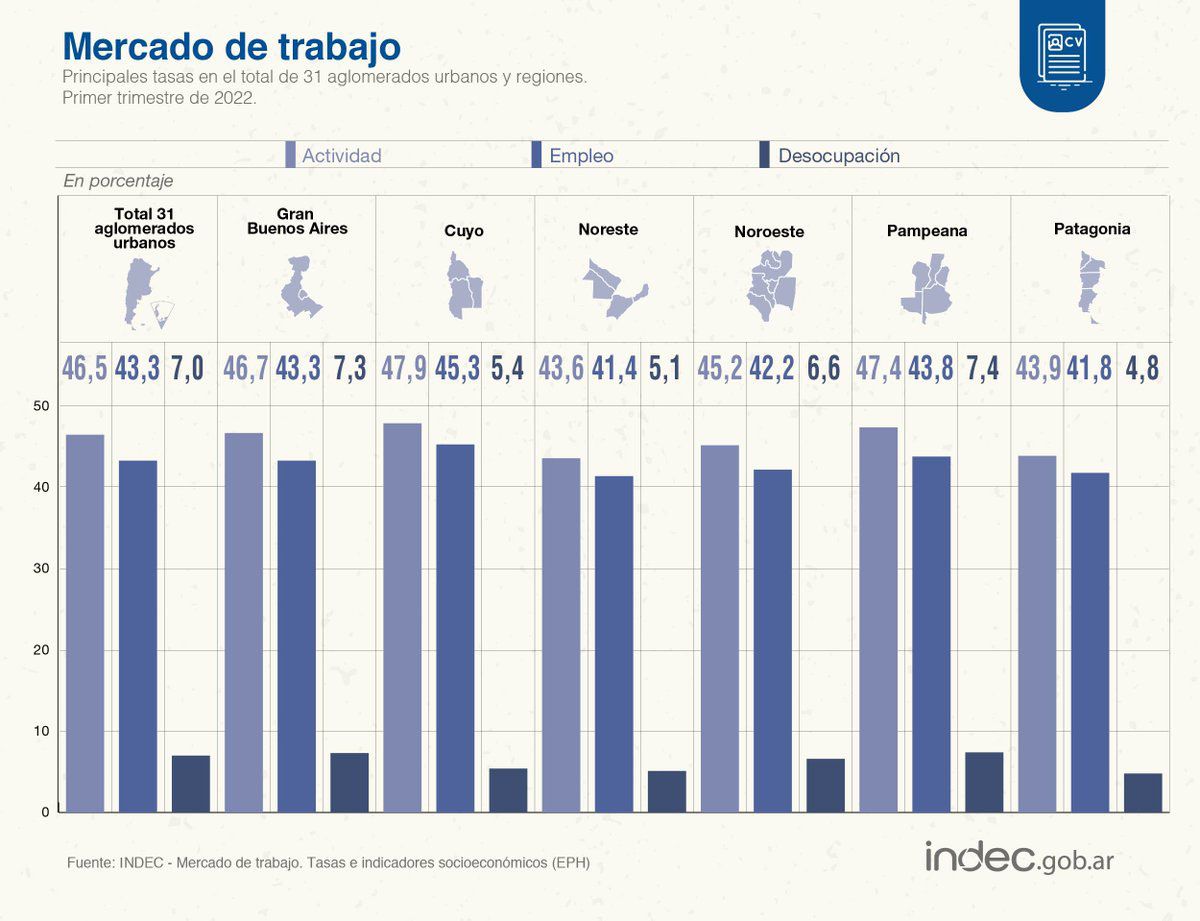 Entre las regiones, las que mostraron la mayor tasa de desocupación fueron las regiones Pampeana y Gran Buenos Aires, con 7,4% y 7,3% respectivamente. Mientras que menor tasa de desocupación correspondió a la Patagonia, con el 4,8%.