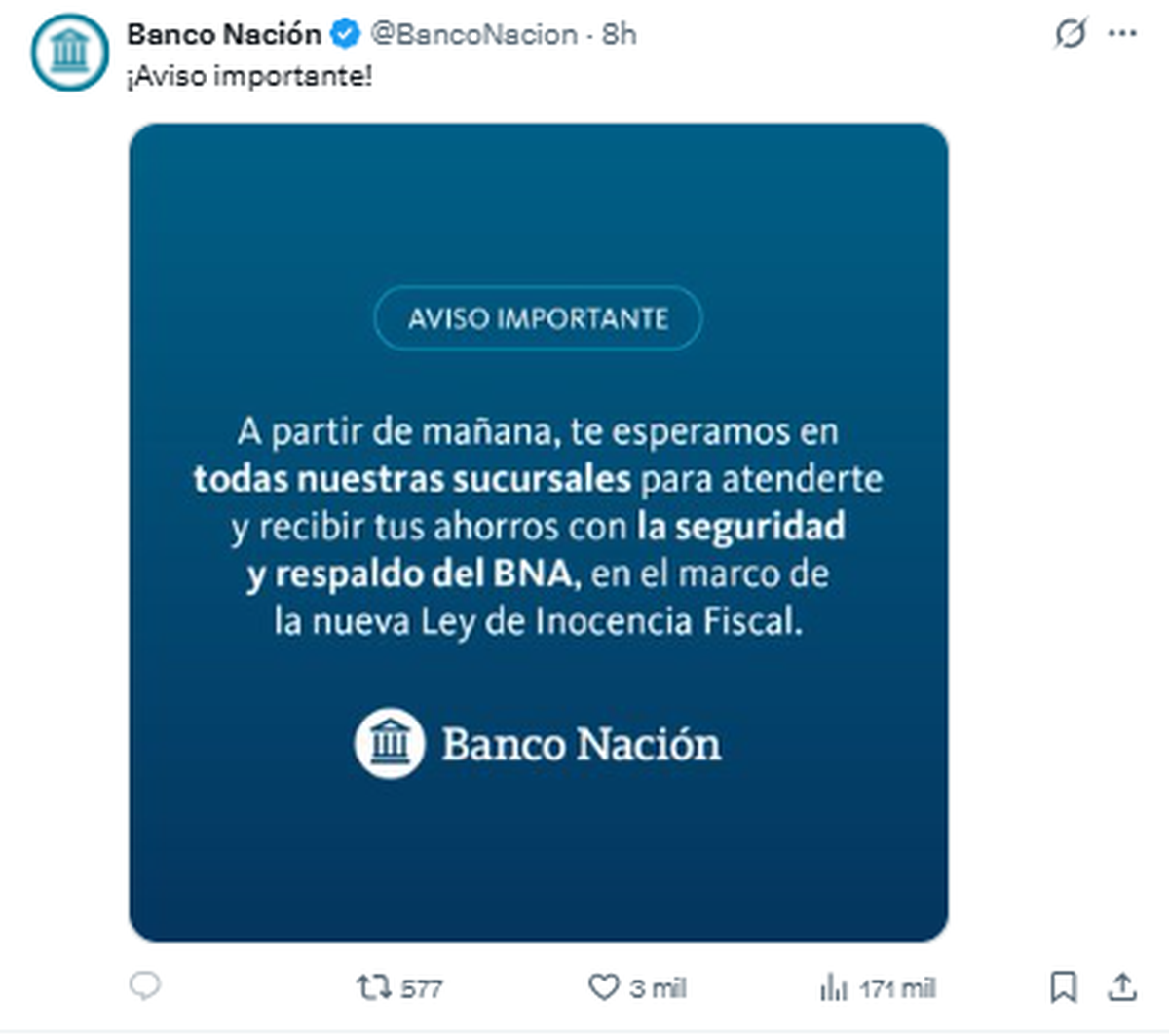 En un mensaje publicado en su cuenta oficial de X, el Banco Nación invitó a adherir a la propuesta: “A partir de mañana te esperamos en todas nuestras sucursales para atenderte y recibir tus ahorros con la seguridad y el respaldo del BNA, en el marco de la nueva Ley de Inocencia Fiscal”, señala el comunicado.