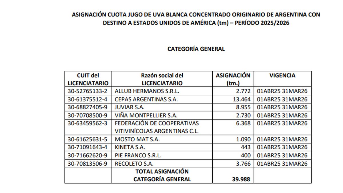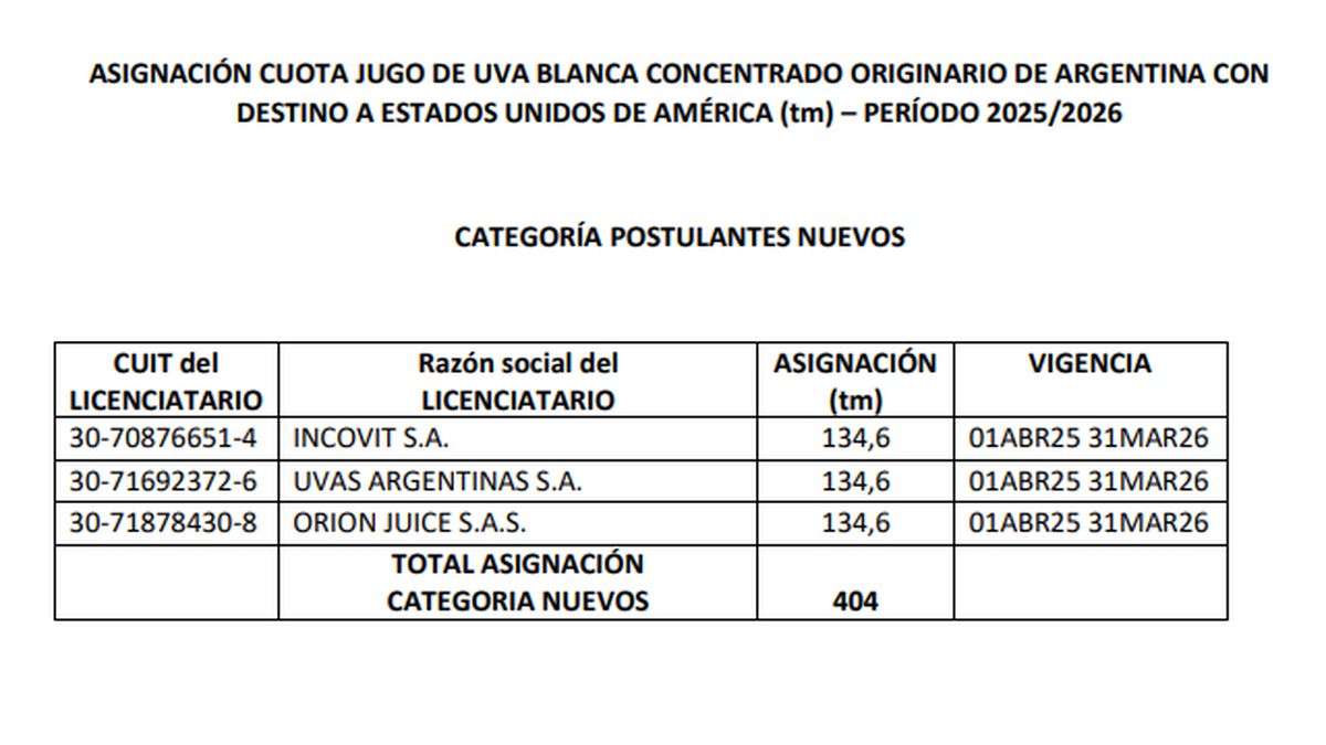 En la resolución que se dio a conocer el reparto del cupo de mosto a exportar a Estados Unidos también se aceptó como nuevos postulantes a Incovit, de Palmira; Orion Juice, Maipú; y Uvas Argentinas, de Luján de Cuyo.
