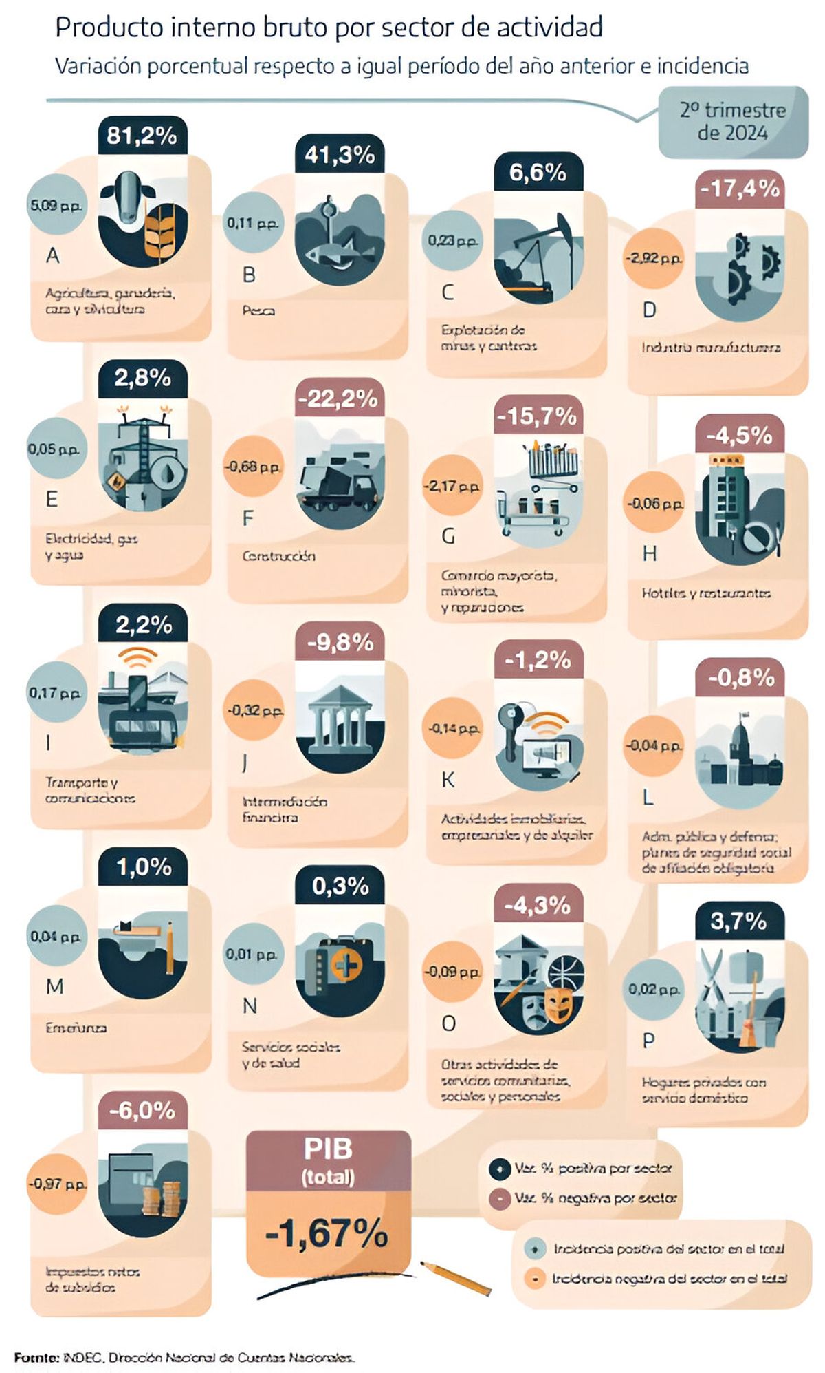 - Descenso general: el Producto Bruto Interno (PBI) disminuyó un 1,7% en comparación con el mismo período del año anterior.