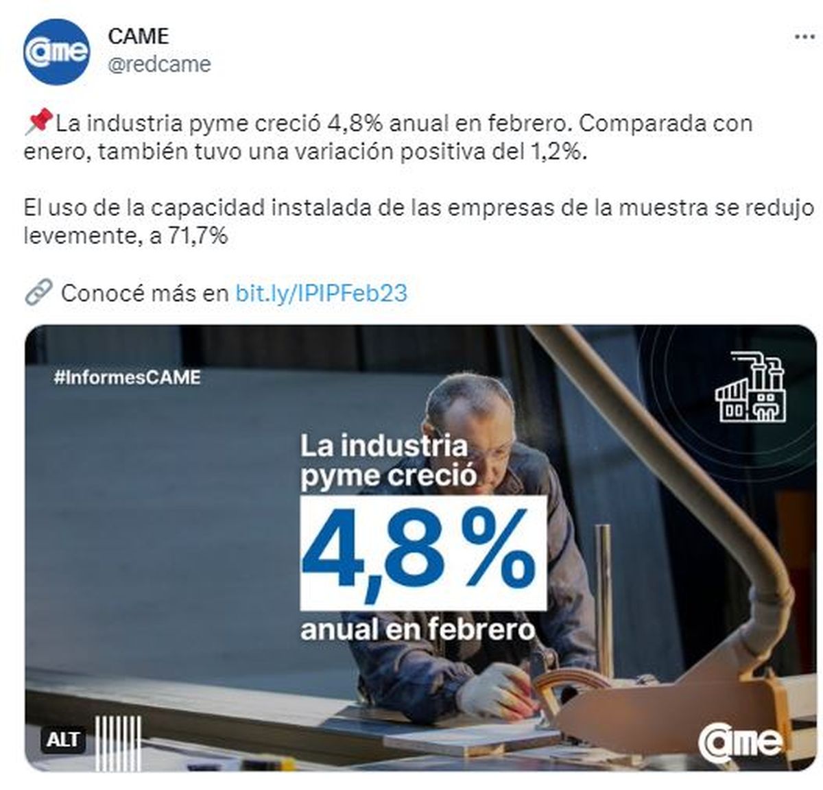 La producción de la industria manufacturera pyme aumentó 4,8% en febrero frente al mismo mes del año pasado, a precios constantes y registró una variación positiva respecto a enero que alcanzó el 1,2%, de acuerdo a un relevamiento de la Confederación Argentina de la Mediana Empresa (CAME).