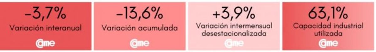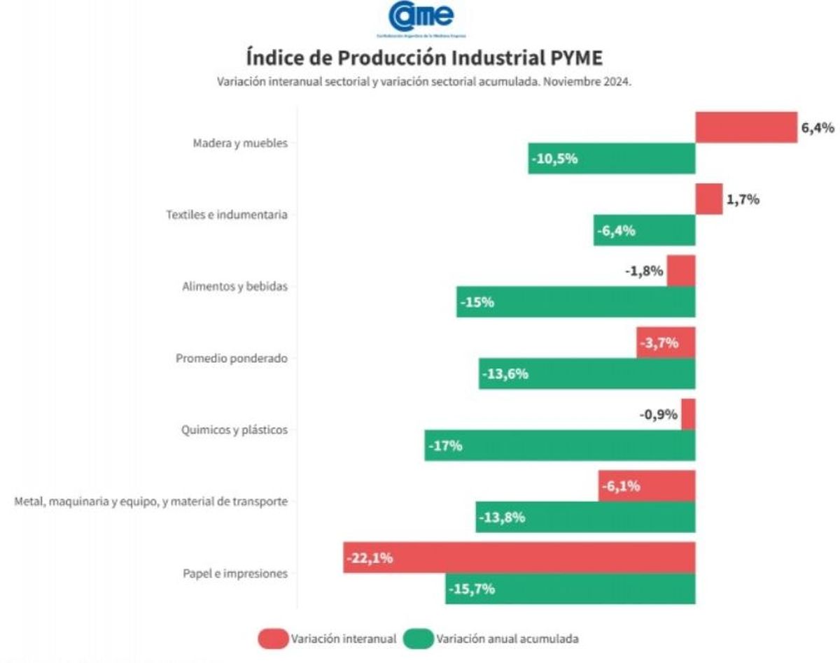 La Confederación Argentina de la Mediana Empresa (CAME) dio a conocer los números de producción de la actividad manufacturera de la industria pyme mostrando una mejora de mes a mes de 3,9%, pero una caída del 3,7% interanual en noviembre.