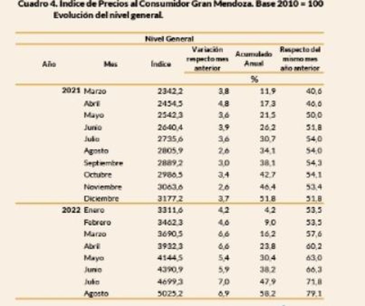 La inflación en Mendoza de agosto llegó al 6,9% (apenas 0,1% menos que el mes anterior) y con ello el acumulado en lo que va del año ya es del 58,2% mientras que el interanual (de agosto de 2021 a agosto de 2022) es del 79,1%.