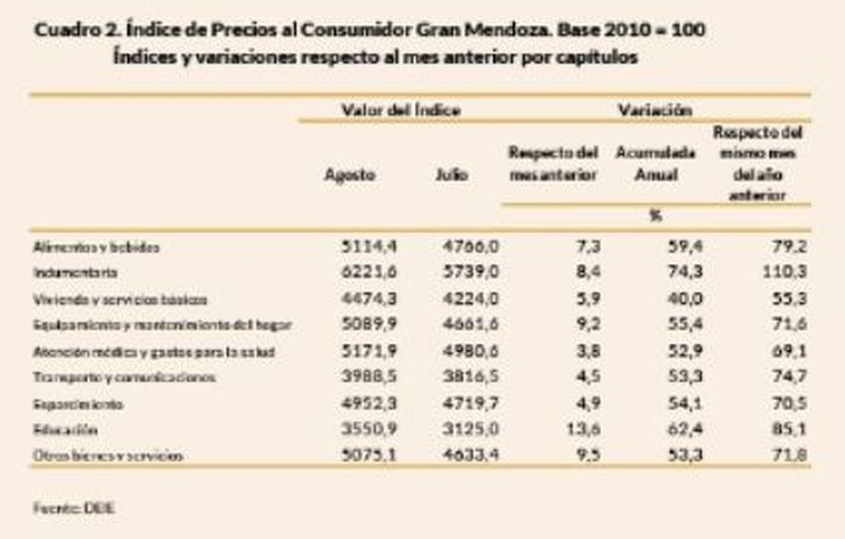 La información fue proporcionada este miércoles por la DEIE (Dirección de Estadísticas e Investigaciones Económicas de Mendoza) que, como lo hace habitualmente, detalló el índice de aumento en cada rubro.