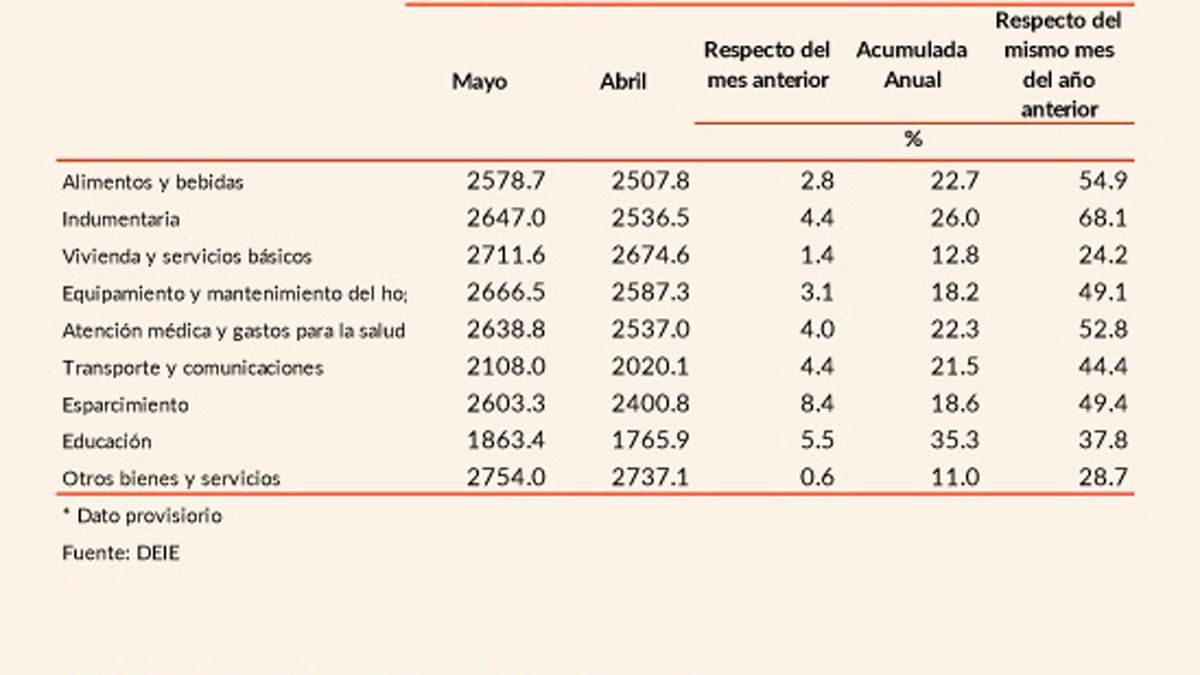 El rubro con más aumento fue el de Esparcimiento con 8% respecto del mes anterior. Le siguieron Educación, con 5,5%; Indumentaria y Transporte y Comunicaciones, con 4,4%; Atención Médica y Gastos para la Salud, con 4%; Equipamiento y Mantenimiento del Hogar, con 3,1%; Alimentos y Bebidas, con 2,8%; Vivienda y Servicios Básicos, con 1,4% y el que menos creció fue Otros Bienes y Servicios, con 0,6%.