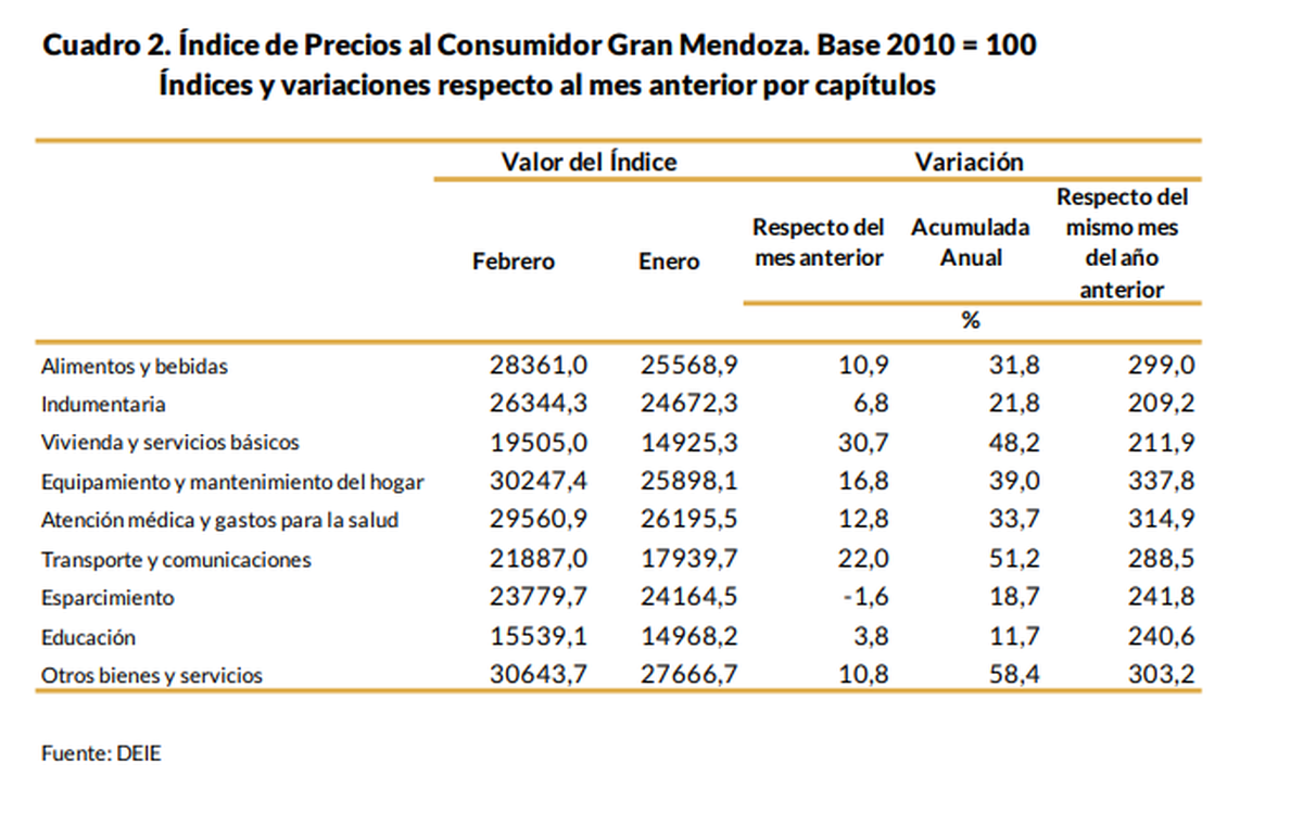Los rubros que más aumentaron son Viviendas y Servicios Básicos con el 30,7% de inflación respecto de enero; Transporte y Comunicaciones con el 22% respecto a enero; Equipamiento y Mantenimiento del Hogar el 16,8%, Alimentos y Bebidas con el 10% con respecto al mes anterior.