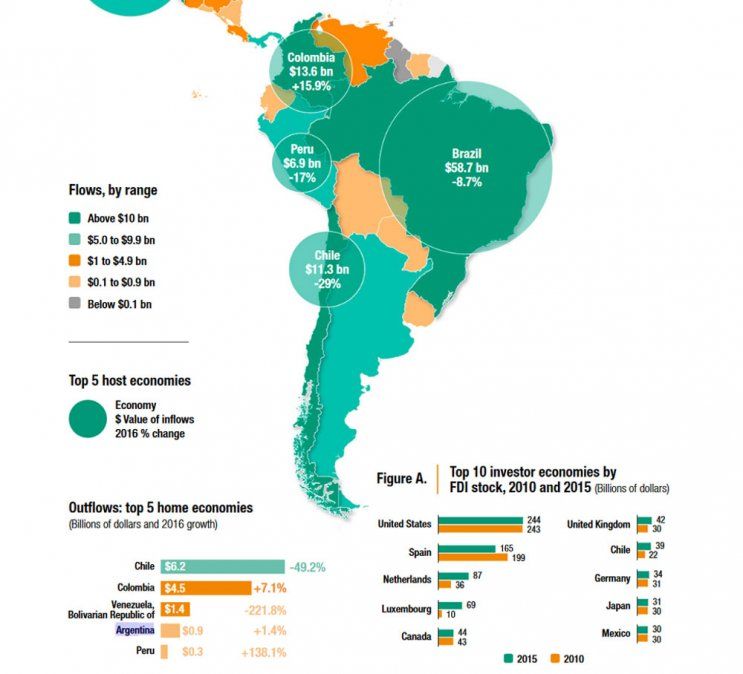 La inversión extranjera directa (IED) en Argentina fue en 2016 de US$ 6.000 millones, lo que implicó una reducción casi a la mitad, sobre todo por la salida de dividendos de las empresas extranjeras hacia sus casas matrices, compensada luego por el brusco salto en el ingreso de capitales ante los nuevos proyectos anunciados por el gobierno.El balance es parte del Reporte Mundial sobre Inversiones 2017 de la Conferencia de las Naciones Unidas sobre Comercio y Desarrollo (Unctad), que prevé un aumento en el flujo de capitales a nivel global de 5% para este año, tras el retroceso de 2% registrado en 2016.Los flujos de IED hacia Argentina se redujeron casi la mitad en 2016, a US$ 6.000 millones, relevó el informe, presentado hoy en Ginebra.De acuerdo con esta oficina de las Naciones Unidas, la caída fue "en gran parte por medidas adoptadas por el gobierno de Mauricio Macri, como el levantamiento de los controles del tipo de cambio en diciembre de 2015".El fin de cepo "normalizó el pago de dividendos para las filiales de empresas extranjeras a sus casas matrices en el exterior, lo que llevó a una marcada reducción en la reinversión de las ganancias, que cayeron de 8.000 millones a 4.000 millones", precisó el reporte.Además, "los préstamos entre compañías giraron hacia posiciones de reembolsos netos, de 2.000l millones a -2.000 millones, en tanto el gobierno alivió las trabas para los pagos en dólares de las deudas de importadores de bienes y servicios prestados por no residentes", evaluó.No obstante, el ingreso de capitales "subió bruscamente de mil millones a US$ 4.000 millones, en línea con los proyectos nuevos anunciados como resultado de los esfuerzos del gobierno por aumentar la inversión", completó la Unctad al referirse a Argentina.A nivel regional, el informe relevó una disminución de 14%, a US$ 142.000 millones, la quinta caída consecutiva y sin diferencias de tendencias de inversión entre el norte y el sur de América Latina y El Caribe, como ocurrió en 2015En Sudamérica, el ingreso de IED se redujo a US$ 101.000 millones, como consecuencia de "la recesión económica, los bajos precios de los productos básicos y el aumento de la inestabilidad monetaria", explicó la organización."Las corrientes hacia Brasil, el principal receptor de IED de la región, se redujeron 9%, a US$ 59.000 millones, arrastradas por un marcado descenso en el sector de los servicios", y también se contrajeron en varios países exportadores de recursos naturales no renovables, como Bolivia, Chile, Ecuador y el Perú, precisó el informe.Por otra parte, las salidas de capitales de las empresas multinacionales de la región se redujeron 98%, a US$ 751 millones, debido a "importantes cambios registrados en las corrientes de préstamos intraempresariales, que llevaron la inversión total en el exterior a una desinversión neta general de activos extranjeros en el Brasil y México".En cuanto a las perspectivas para la región este año, la Unctad estimó que "siguen siendo sombrías", ya que "se prevé que el crecimiento económico se mantendrá muy por debajo de las tasas asociadas con las mayores entradas registradas en años anteriores"."Es probable que la inversión en las industrias extractivas de la región siga siendo moderada", ya que "los anuncios de proyectos de IED en nueva planta para el sector en 2016 ascendieron solo a US$ 4.000 millones", debido a que "los operadores continúan con fortaleciendo sus balances y reestructurando sus planes de gastos de capital", precisaron los analistas.Además, el informe advirtió que la IED hacia la región también puede estar afectada este año "por la incertidumbre relativa a la formulación de las políticas económicas en Estados Unidos".A nivel mundial, la IED aumentará un 5 por ciento, casi US$ 1,8 billones, luego del retroceso de 2%, -a US$ 1,75 billones-, registrado en 2016.Las proyecciones más optimistas se atribuyeron al "mayor crecimiento previsto en las principales regiones, la reanudación de la expansión del comercio y la recuperación de los beneficios empresariales".Según las previsiones, el modesto incremento de las corrientes de IED continuará en 2018, a unos US$ 1,85 billones, aunque a niveles inferiores al récord de US$ 1,9 billones en 2007.Estados Unidos, China y la India serán los principales destinos de esa inversión, en tanto, salvo América Latina y el Caribe, las perspectivas de la IED "son moderadamente positivas en la mayoría de las demás regiones", resaltó el informe"El camino hacia la plena recuperación de la IED sigue siendo lleno de escollos, pero nos sentimos cautamente optimistas. Si bien el informe prevé un modesto aumento en 2017, otros factores como la intensificación de los riesgos geopolíticos y la incertidumbre acerca de las políticas pueden incidir en la escala del repunte" sostuvo el secretario general de la Unctad, Mukhisa Kituyi, al presentar el informe.En 2016, Estados Unidos siguieron siendo el principal receptor de IED, por un monto de US$ 391.000 millones, seguidos por el Reino Unido (254.000 millones), y China (134.000 millones).Por otras parte, el Informe, que hace un seguimiento de la actividad empresarial en varios sectores, concluye que las corrientes de IED al Grupo de los 20 superaron por primera vez el billón de dólares."La actividad de la IED en las principales agrupaciones económicas, como el Grupo de los 20 y el Foro de Cooperación Económica Asia-Pacífico, tuvieron gran incidencia en las tendencias mundiales de la IED", concluyó el reporte.