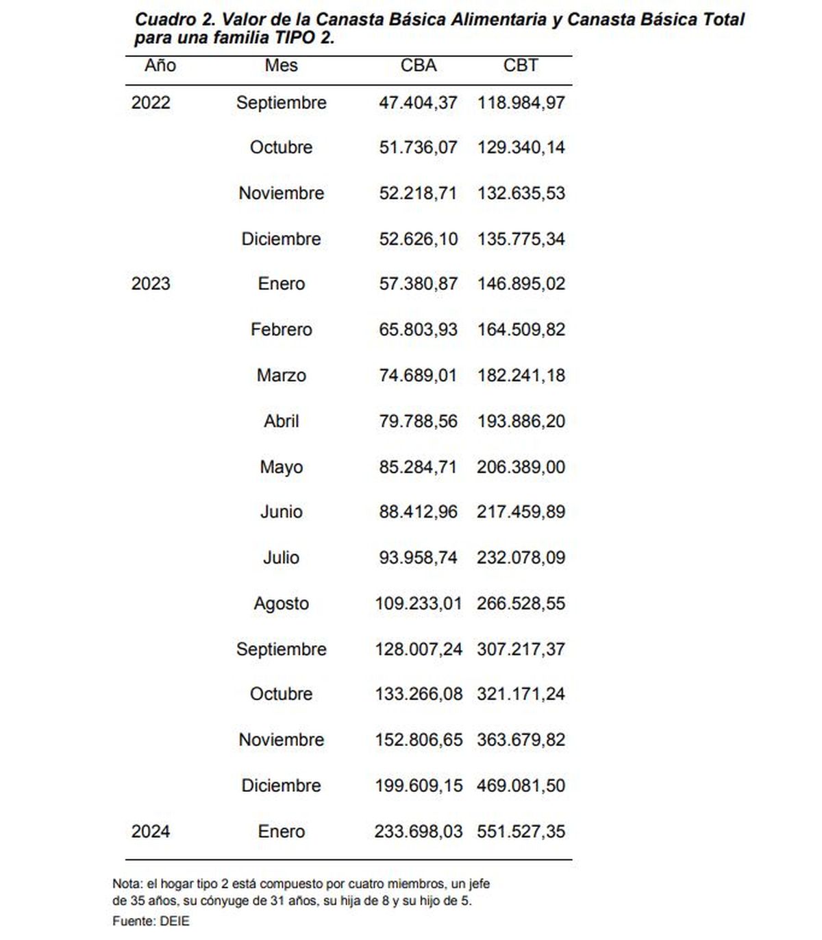 La variación mensual de la CBA en diciembre había sido del 30,1%, mientras que la de la CBT había sido de 27% con respecto a noviembre, ambas por encima de la inflación, que fue del 25,5% ese mes.