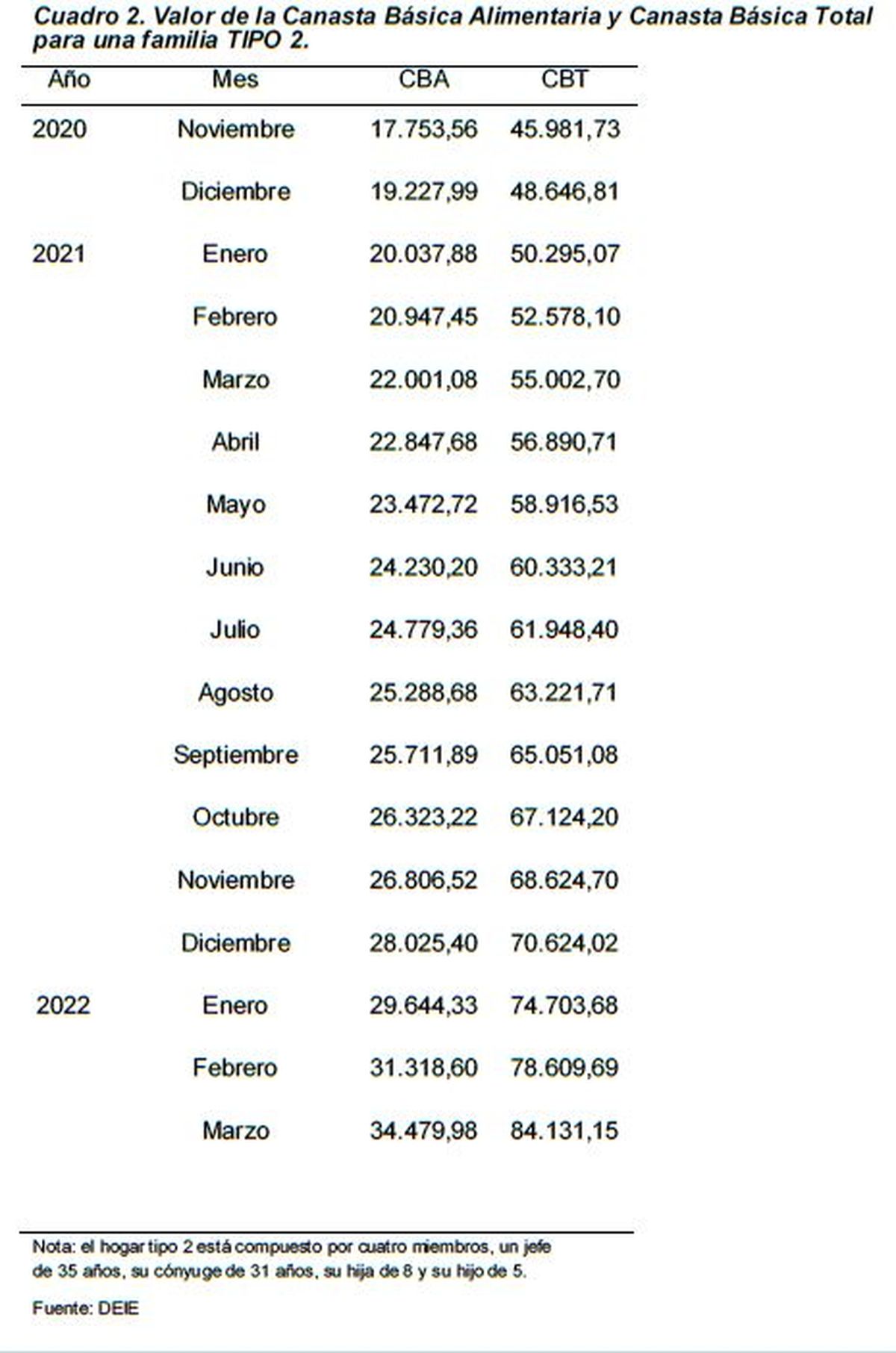 La Canasta Básica Total (CBT) nacional difundida por el INDEC , que define el nivel de pobreza para una familia tipo de cuatro miembros registró en marzo un costo de $89.690 tras aumentar en ese mes un 7% superando el aumento de la inflación.