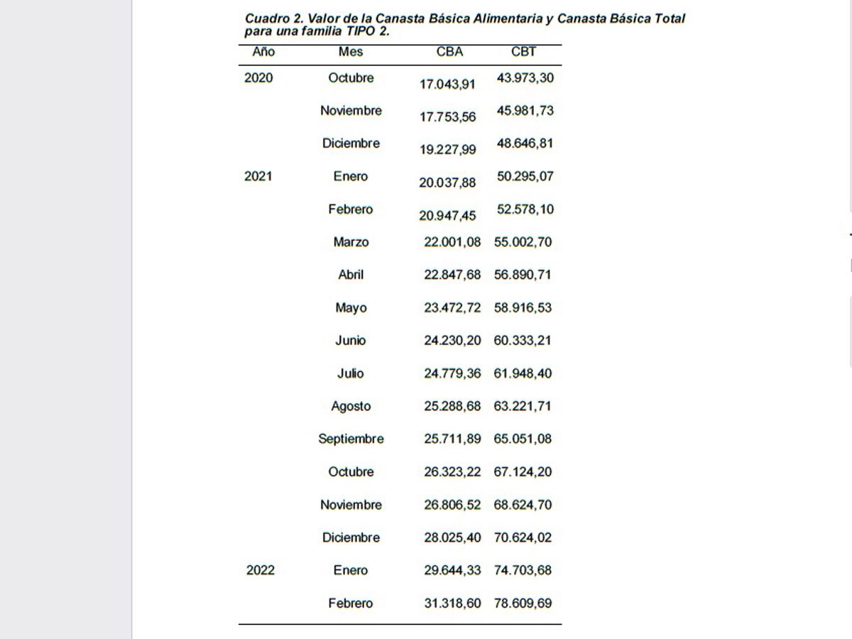 la canasta básica total (CBT) aumentó 6,6% durante febrero, por lo cual esa misma familia tipo requirió percibir ingresos por $ 83.807 para no caer debajo de la línea de la pobreza.