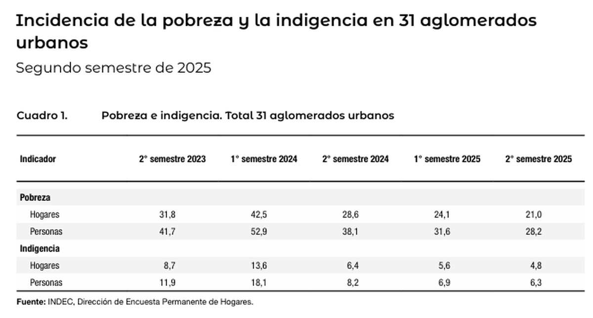 Luego de la segunda baja consecutiva, la pobreza cerró el 2025 en 28,2% según los últimos datos de la EPH (Encuesta Permanente de Hogares) de INDEC. Eso implica una reducción de 3,4 puntos respecto de hace un año y de casi 10 puntos en relación a fines del 2024.