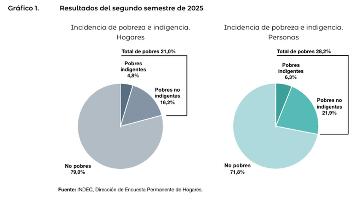 Los resultados de la primera mitad del 2025 indicaban que un 24,1% de los hogares se consideraban pobres, es decir, sin capacidad de solventar la Canasta Básica Total (CBT). En cifras, 2.456.090 entre los 31 conglomerados urbanos del país que toma la medición. Del mismo modo, un 31,6% de las personas, un porcentaje equivalente a más de 9,4 millones.