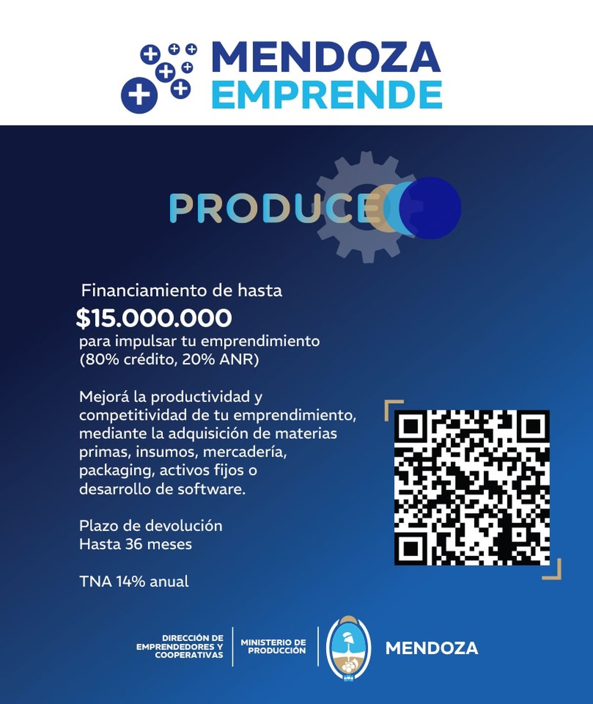 El Ministerio de Producción, a través de la Dirección de Emprendedores y Cooperativas, anunció que el programa destinado al desarrollo y crecimiento de emprendedores mendocinos Mendoza Emprende Produce ampliará su alcance y otorgará créditos de hasta $15 millones para el desarrollo de emprendimientos locales.