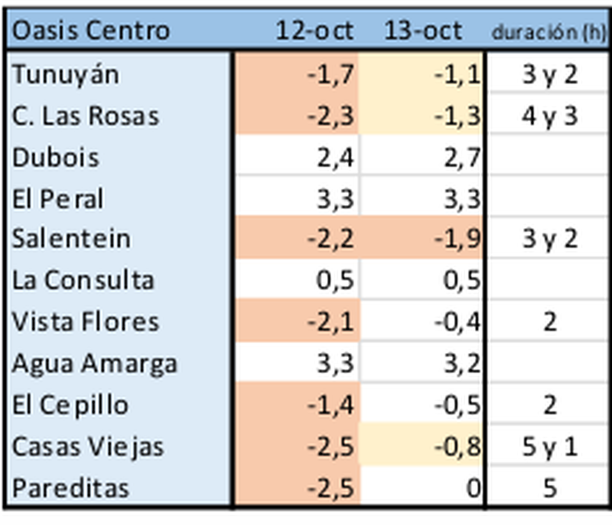 Entre las zonas más golpeadas aparecen de acuerdo a un reporte de la Dirección de Contingencias Climáticas están Tunuyán y San Carlos. En esos lugares las estaciones que detectan las variaciones de temperatura llegaron a marcar -2,5ºC.