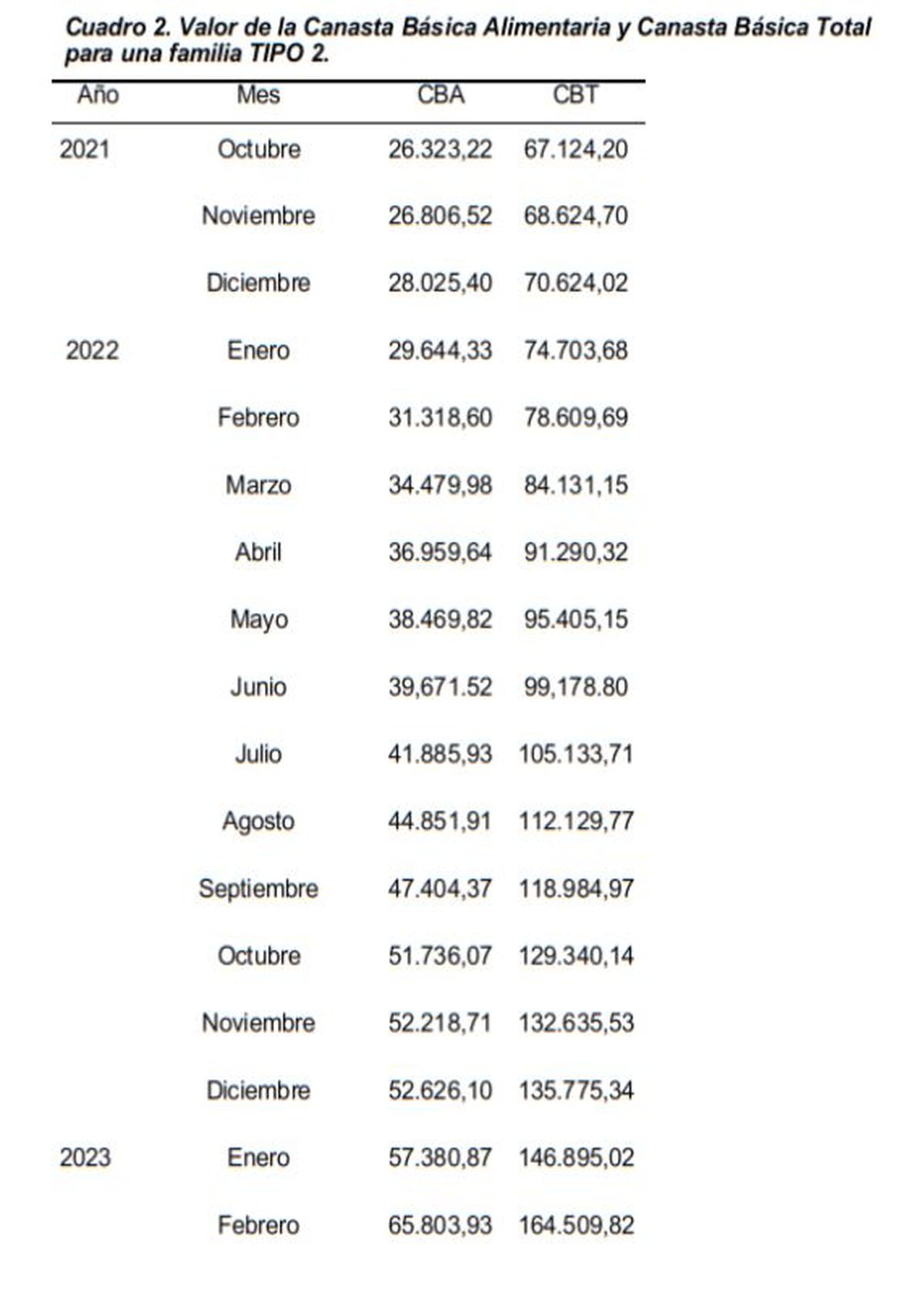 La CBA nacional acumuló un incremento de 115,1% en los últimos 12 meses; mientras que la CBT subió 111,3% en el mismo período y acumulan incrementos del 19,8% y 16,1% en el primer bimestre del año, respectivamente, precisó el organismo.