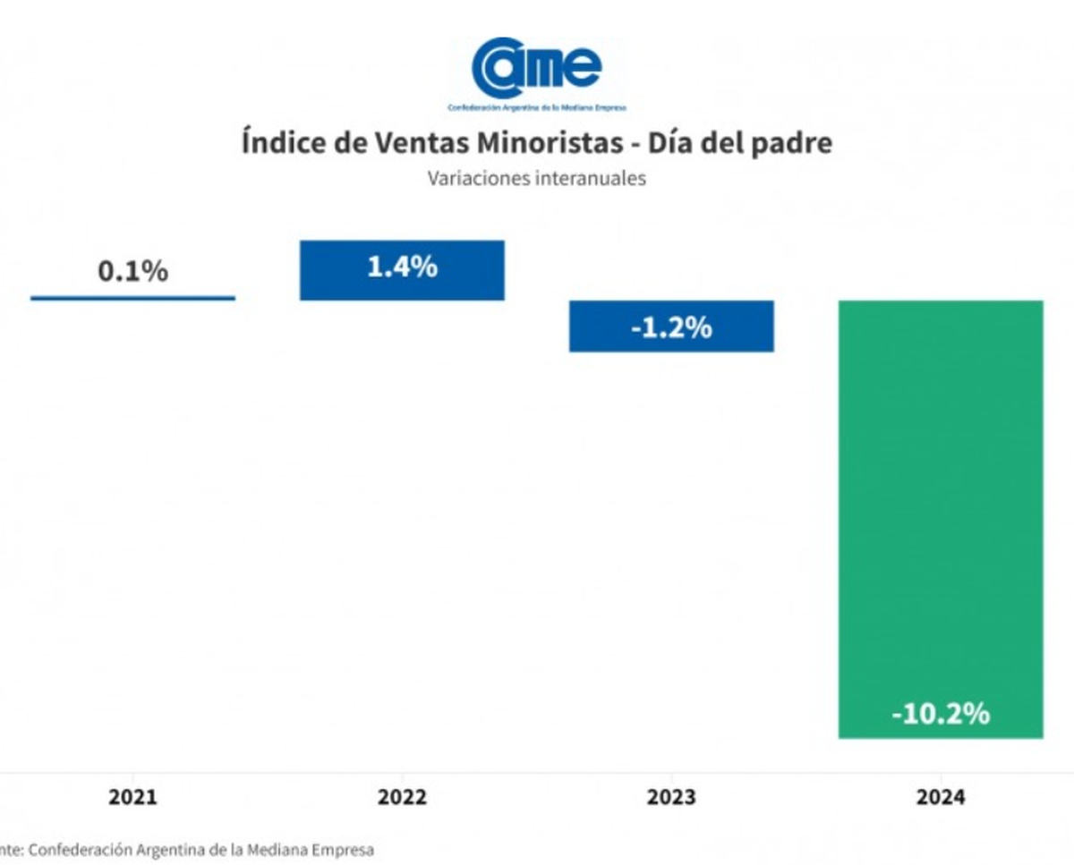 Las ventas por el Día del Padre 2024 registraron una caída del 10,2% frente a las del año pasado, medidas a precios constantes, de acuerdo a un relevamiento elaborado por la Confederación Argentina de la Mediana Empresa (CAME). La tradicional celebración este año no se salvó del impacto de la recesión en la economía argentina.