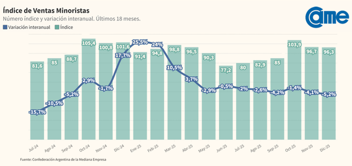 El comercio pyme cerró 2025 con una caída de ventas minoristas en diciembre de 5,2% a precios constantes según CAME (Cámara Argentina de la Mediana Empresa). Y gracias al repunte intermensual, el año apenas redondeó 2,5%.