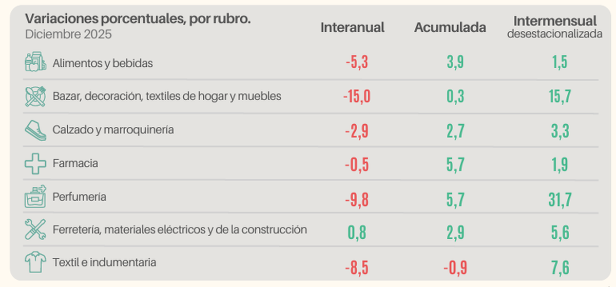 El análisis confirma la tendencia recesiva reciente: seis de los siete rubros relevados finalizaron en rojo. Y le pusieron un broche indeseado a un 2025 con 8 meses consecutivos de variaciones negativas.