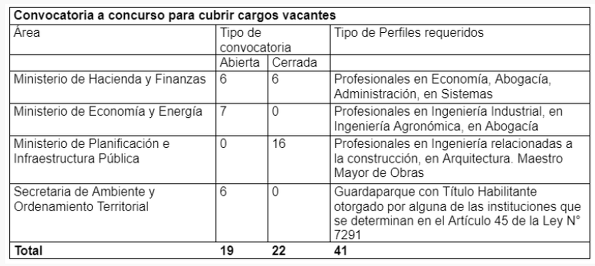 Se concursarán un total de 41 cargos, 19 de ellos corresponden a concursos abiertos de ingreso y los 22 restantes a concursos cerrados de ascenso. Los concursos de ingresos están principalmente destinados a cubrir cargos de Guardaparques que se desempeñarán en la Dirección de Recursos Naturales Renovables, de profesionales en ingeniería industrial y agronómica que se desempeñarán en la Unidad de Control Cannabis y en la Dirección de Agricultura, quienes buscarán la expansión de actividades agrícolas en la provincia.