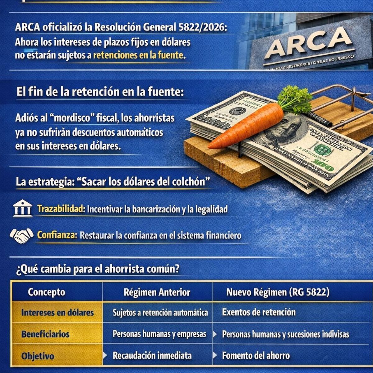 - Trazabilidad: Al eliminar la carga inmediata (retención), ARCA fomenta que el dinero circule en cuentas legales, facilitando la identificación y formalización de la economía.