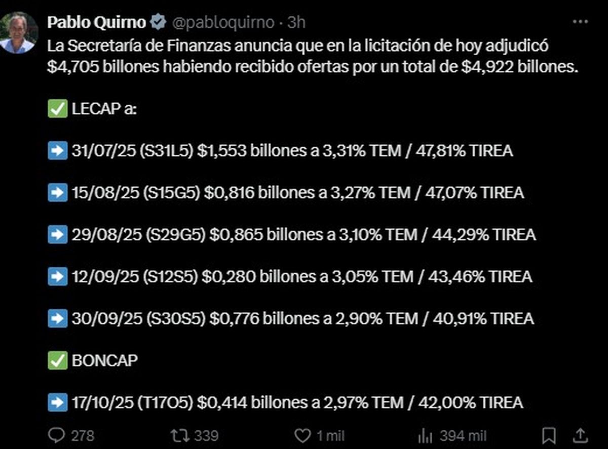 El secretario de Finanzas, Pablo Quirno, informó a través de su cuenta de la red social X que “se adjudicaron $4,705 billones habiendo recibido ofertas por un total de $4,922 billones”.