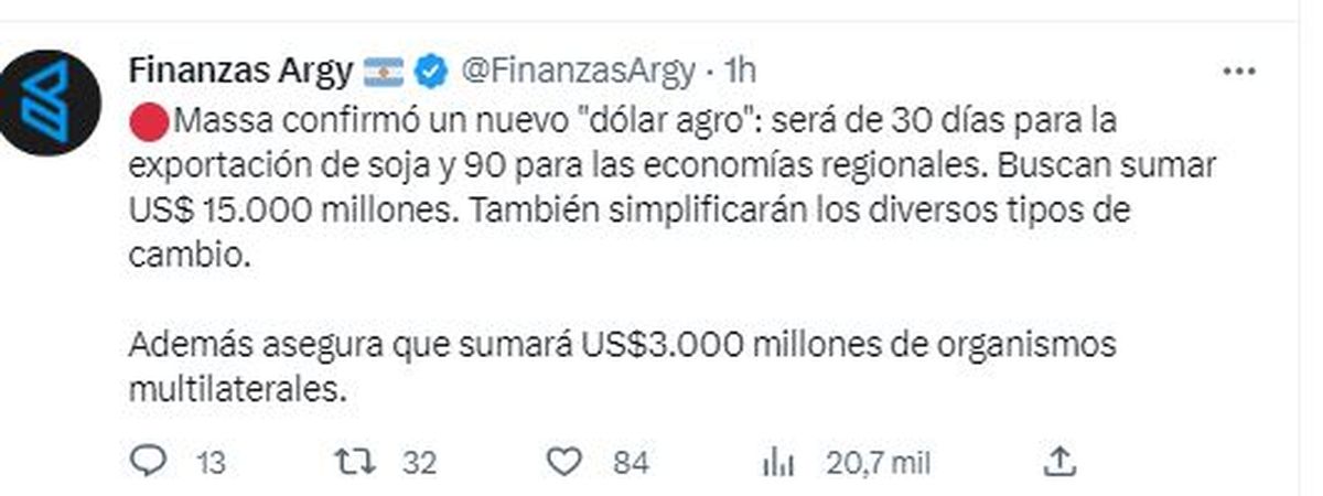 El sitio especializado Finanzas Argy explicó que "Massa confirmó un nuevo dólar agro: será de 30 días para la exportación de soja y 90 para las economías regionales. Buscan sumar US$ 15.000 millones. También simplificarán los diversos tipos de cambio. Además asegura que sumará US$ 3.000 millones de organismos multilaterales".