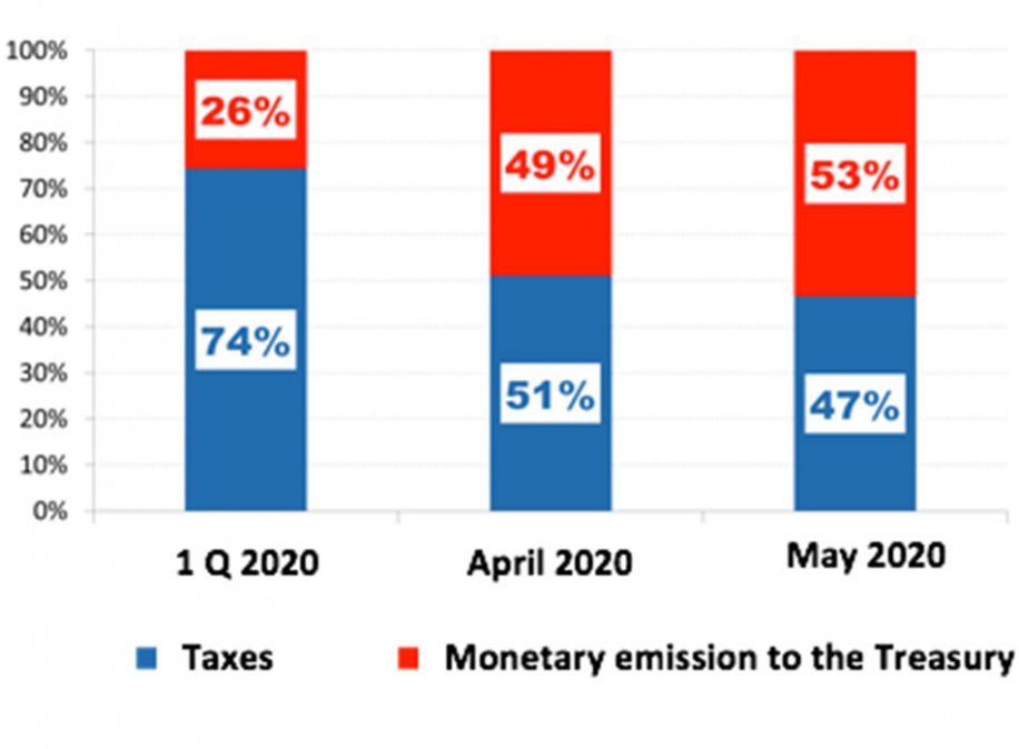 En abril del 2020, el 51% provino de impuestos y el 49% de emisión monetaria; y en mayo la ecuación ya se invirtió: el 47% provino de impuesto y el 53% de la impresión de moneda por parte de la autoridad monetaria.