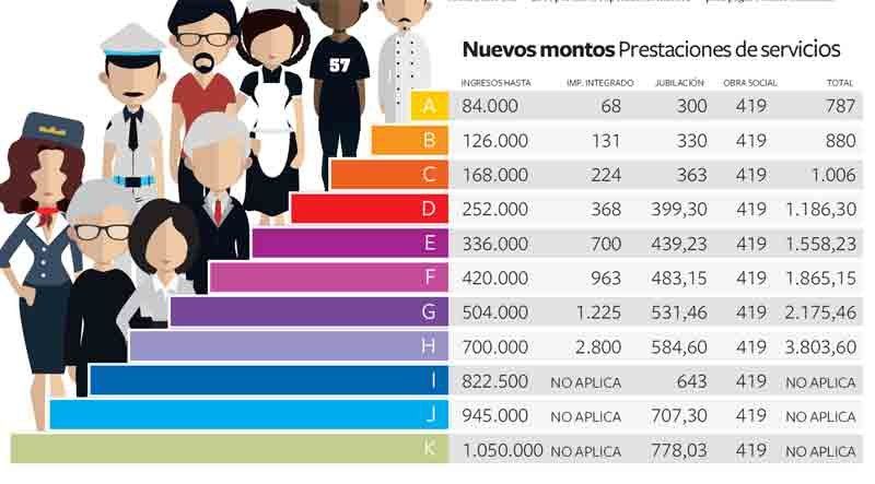 Si bien van a notar que la cuota subió a la par de los límites de facturación, hay que decir que subieron el impuesto integrado y la jubilación, ya que el monto por obra social se mantiene en $419, que es lo que regía anteriormente.