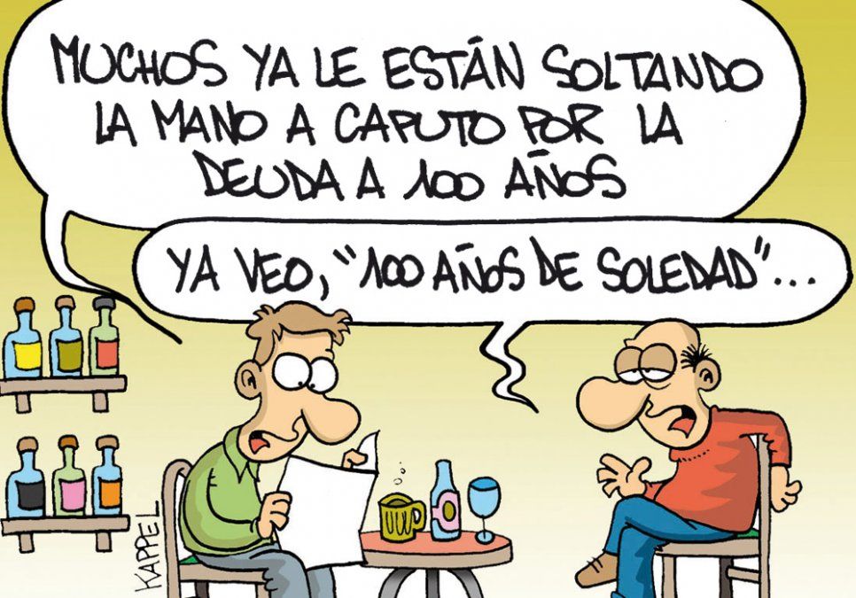 Inicio Economía El humor de Kappel El humor de Kappel. 05 de julio de 2017 - 12:00 Otra que "Cien años de soledad" Por UNO Temas relacionados: El humor de Kappel Humor las más leídas Es concejal electo La condena de la Corte al antiminero Marcelo Romano desató un conflicto por su banca Por Rosana Villegas Avance en la causa Imputaron al Piter Morales como el instigador del ataque a la nena baleada en Godoy Cruz Por Sebastián Salas Planteo empresarial Tres ministros recibieron a cámaras empresariales tras el reclamo de las pymes Por Rosana Villegas Viviendas Casa propia: cómo ser dueño de una vivienda del IPV y pagar $323.000 de cuota Por Daniel Calivares Lo que se lee ahora Economía Una provincia confirmó un bono de $600.000 por el Día del Trabajador y otro de $1.200.000 como refuerzo Te puede interesar Todo entre abril y julio Una provincia confirmó un bono de $600.000 por el Día del Trabajador y otro de $1.200.000 como refuerzo Liquidación Un banco lleva a remate en Mendoza maquinaria agrícola y paneles solares por más de $234 millones Informe Según el Consejo Empresario Mendocino, el Estado se "achicó" casi 4% en 10 años