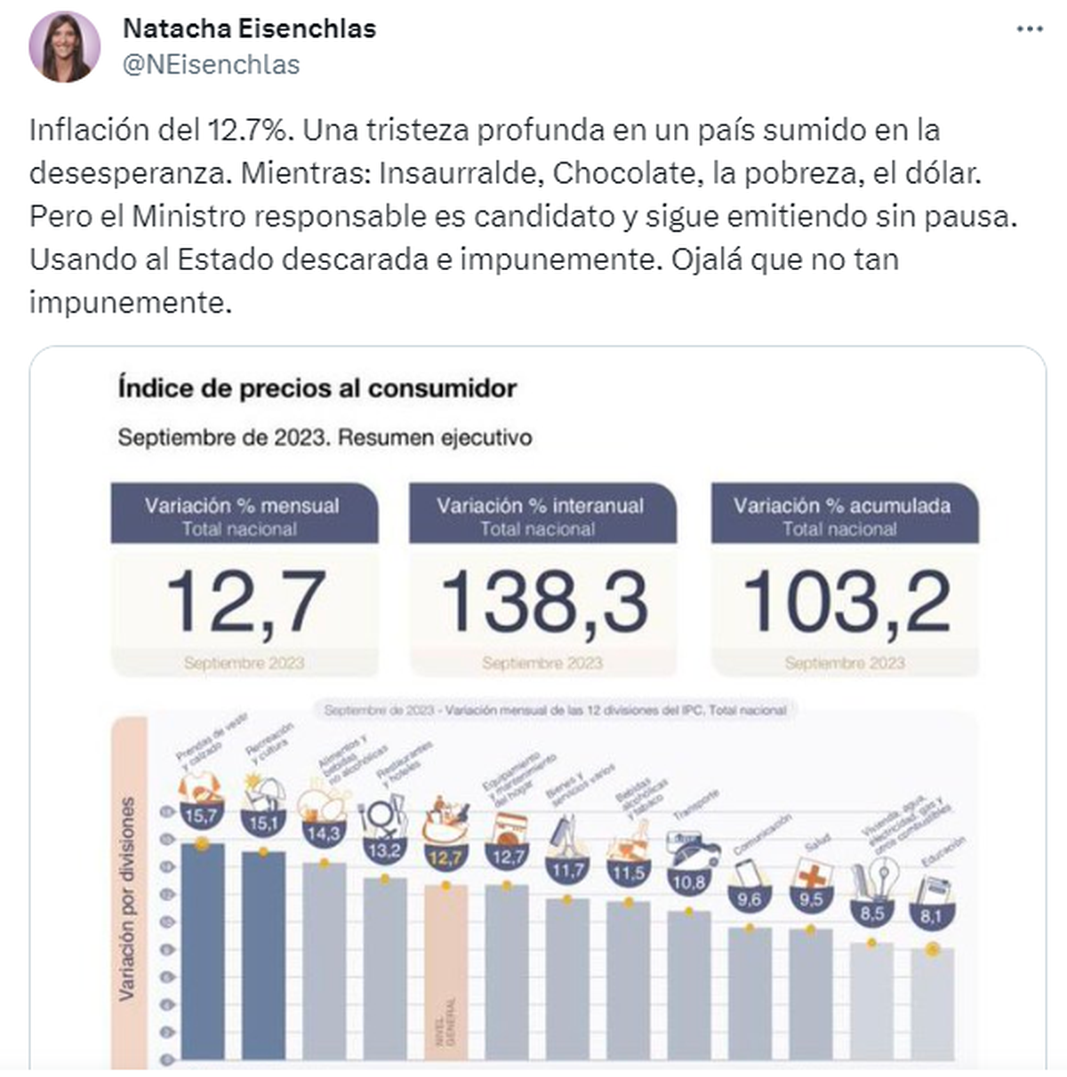 La fuerte escalada de la inflación generó reacciones en el arco político de Mendoza, sobre todo del sector opositor al gobierno. Fue el caso de la senadora provincial Natacha Eisenchlas (Cambia Mendoza), quien se manifestó en Twitter y volvió a responsabilizar al gobierno nacional sobre la profunda crisis del país.