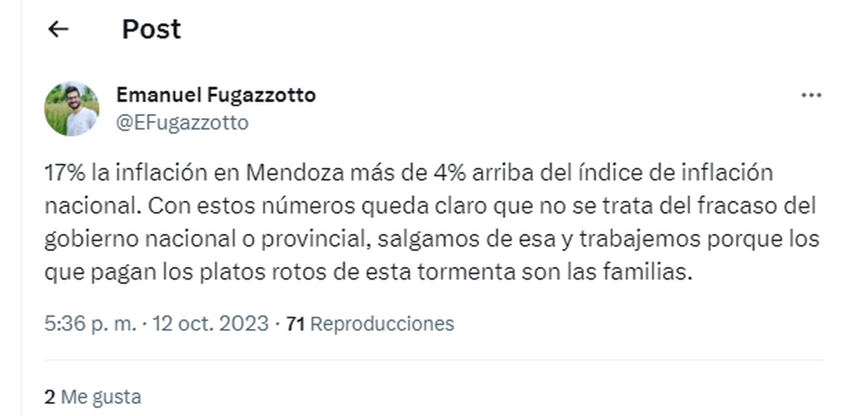 Otro de los que también se expresó a través de la red social X, fue el diputado provincial Emanuel Fugazzotto (Partido Verde), quien se enfocó en los datos de Mendoza y llamó a buscar soluciones para las familias más vulnerables.
