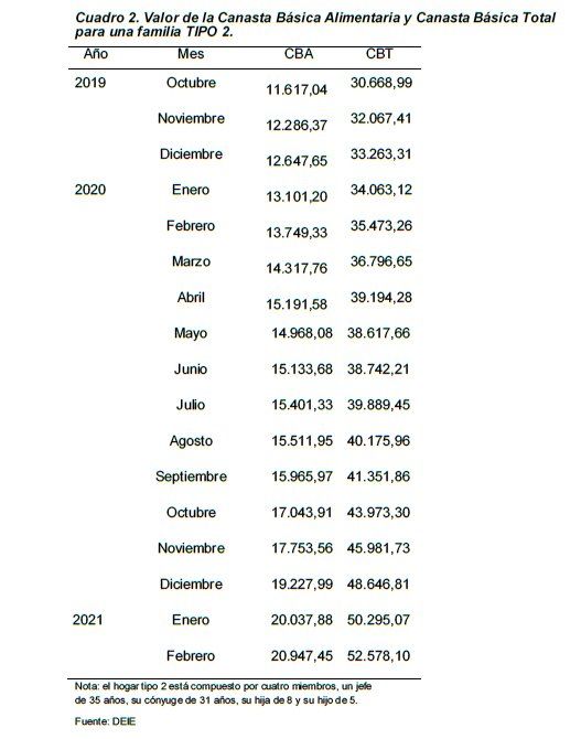 A nivel nacional, la Canasta Básica Total (CBT) registró en febrero un aumento de 2,7%, respecto de enero, y una variación interanual de 42,2%. En el caso de la Canasta Básica Alimentaria (CBA), que mide exclusivamente el consumo de alimentos, sin tener en cuenta las tarifas, la variación mensual respecto de enero fue de 3,6% y la interanual es 46,4%, agregó el organismo.