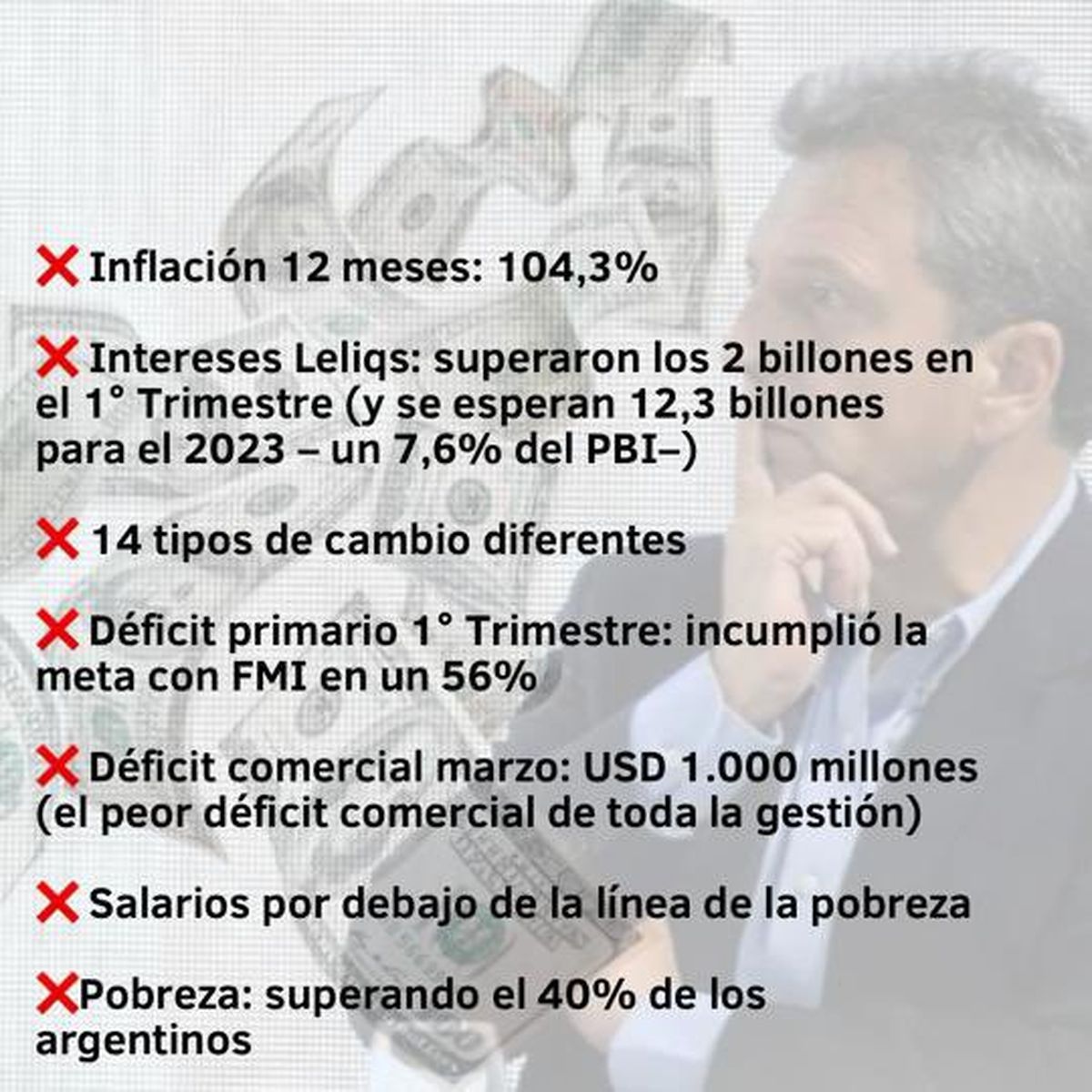 Verasay publicó además en sus redes sociales un gráfico con datos sobre lo que considera los puntos negativos de la gestión de Massa. Con una imagen de fondo del funcionario nacional, hace referencia a la inflación de los últimos 12 meses y a los índices de pobreza entre otros aspectos.