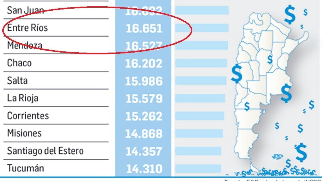 En la tabla de los salarios, Entre Ríos está más cerca de las provincias en los que los salarios son más bajos: en promedio en el sector privado se gana 16.651.