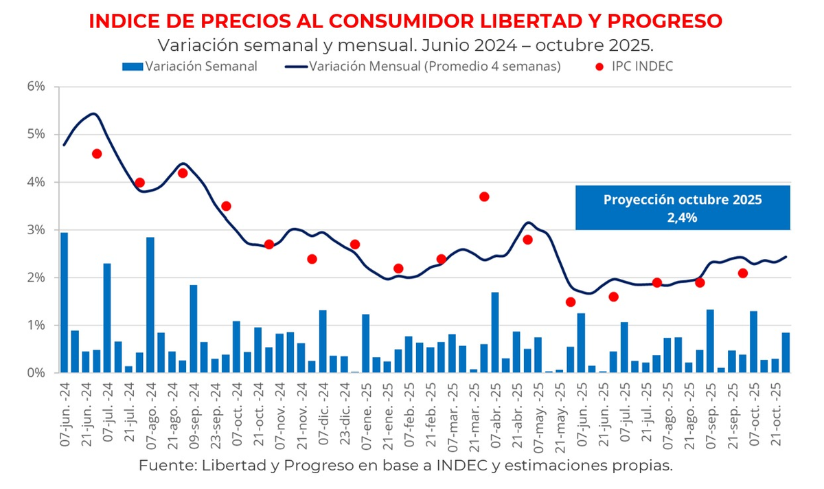De acuerdo con los pronósticos, la inflación mensual ya mostraba un piso de 2,3% la segunda semana del mes. Pero los precios se aceleraron previo a las elecciones para completar un IPC de 2,4%, según la Fundación Libertas y Progreso.