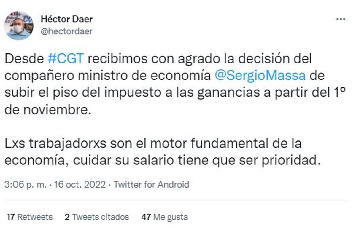 Massa adelantó que a partir del 1° de noviembre se aplicará una suba del mínimo no imponible que pasará de los $280.700 actuales a "estar por encima de los $330.000 para garantizar que los trabajadores no pierdan en el impuesto a las Ganancias lo que ganan en horas extras y en la paritaria", en declaraciones a radio Rivadavia.