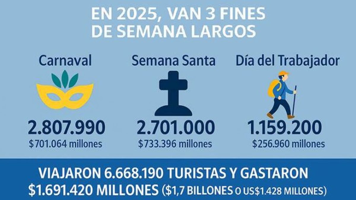 Con esos números, en lo que va del año 2025, van tres fines de semana largos en los cuales viajaron por el país 6.668.190 turistas y gastaron $1.691.420 millones ($1,7 billones o US$1.428 millones).