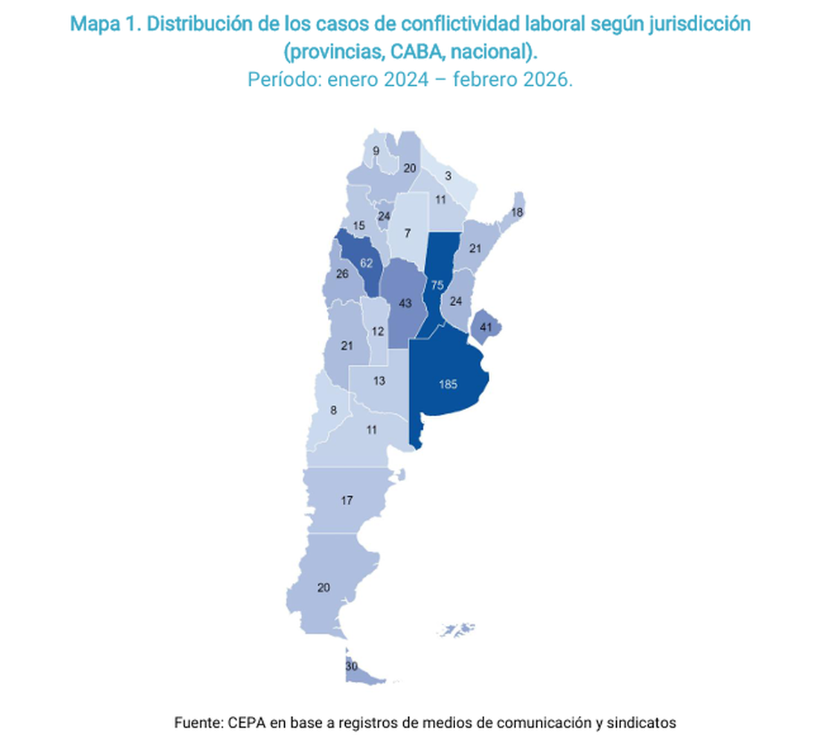 Los datos son parte de un relevamiento realizado por el CEPA (Centro de Economía Política Argentina), para conformar un mapa de la conflictividad laboral en todo el país en base a casos registrados en los 2 últimos años. Así, toma 717 compañías que se vieron envueltas en distintas situaciones entre enero de 2024 y de febrero de 2026.