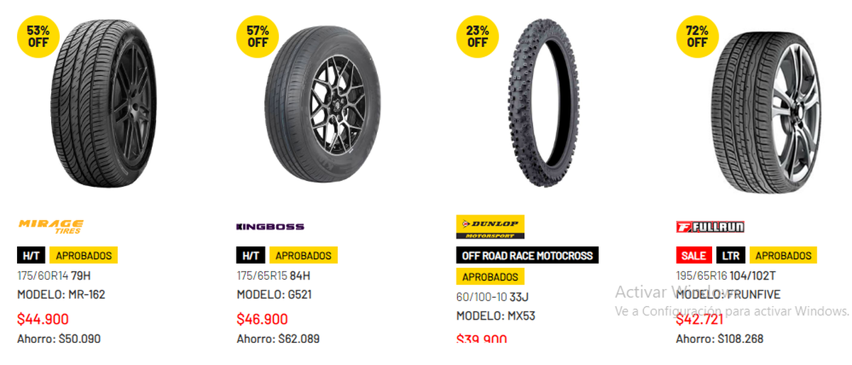 En Neumáticos y Llantas del Pacífico (Chile) se exhiben promociones por el cambio de las cuatro ruedas a 200.000 chilenos, lo que en plata argentina son $214.000.