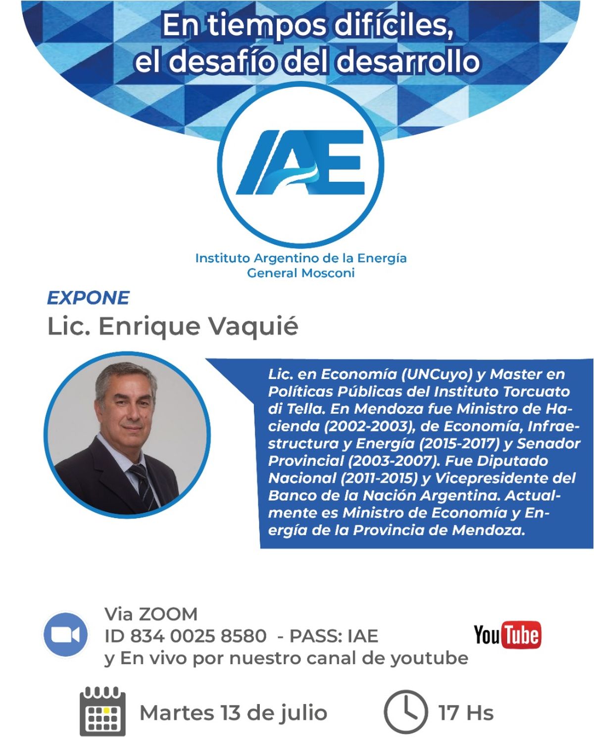 El ministro de Economía y Energía, Enrique Vaquié, expondrá para el organismo nacional más prestigioso de estudio, investigación, asesoramiento y difusión de temas energéticos. Su charla “En tiempos difíciles, el desafío del desarrollo”, contará los detalles de Mendoza Activa, un programa pionero que logró mantener la producción y hacer crecer el empleo en tiempos de pandemia.