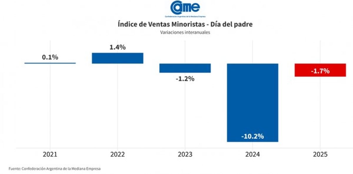 El Índice de Ventas Minoristas para el Día del Padre elaborado por la Confederación Argentina de la Mediana Empresa (CAME) registró por tercer año consecutivo una variación interanual negativa, reflejando una tendencia sostenida de debilidad en el consumo vinculado a esta celebración.
