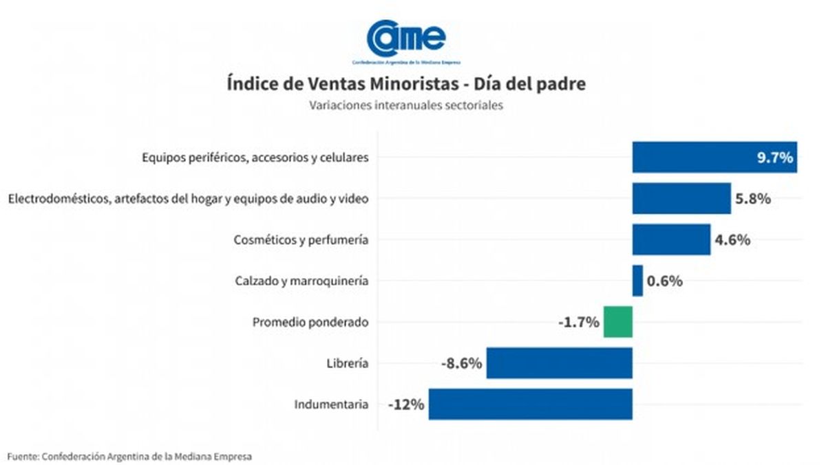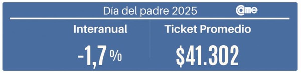 Las ventas minoristas por el Día del Padre 2025 cayeron 1,7% frente al 2024, medidas a precios constantes, con más del 90% de los comercios realizando promociones especiales y desde la organización que agrupa a las pequeñas y medianas empresas (CAME) dijeron que la situación es cada vez más preocupante.