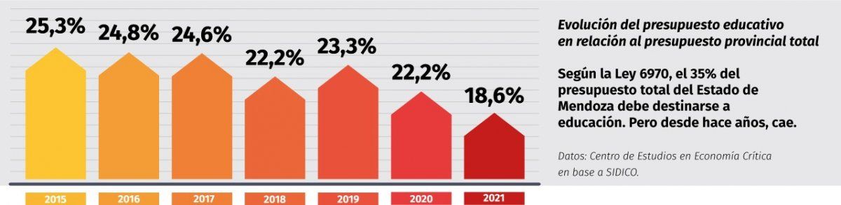 ¿Cómo se llega a esto? Porque desde hace años el presupuesto cae (ver gráfico). Y es una decisión política, porque las escuelas no son prioridad. Según la ley de educación provincial vigente, el 35% del presupuesto anual del Estado debería estar destinado a educación. En 2021, será del 18%.