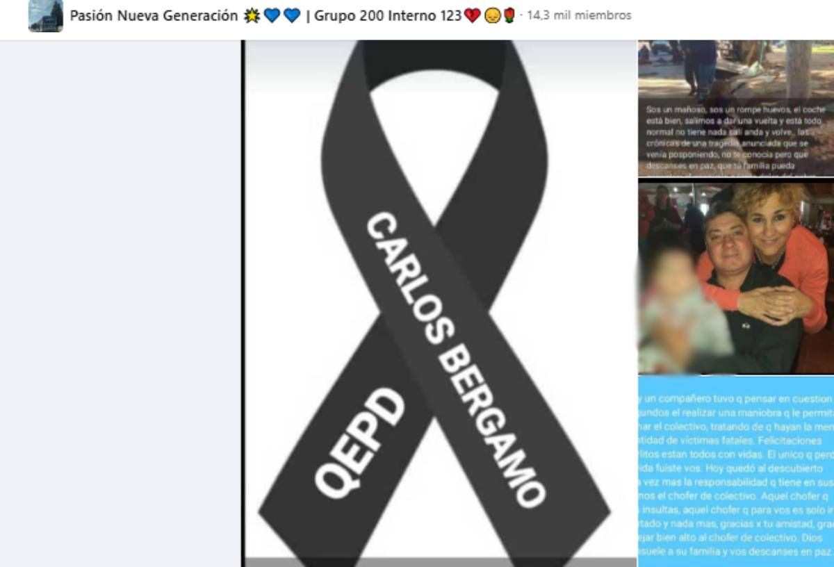 En el posteo que generó comentarios y las condolencias para la familia de Bérgamo que estaba a punto de jubilarse, se sostiene que "hoy un compañero tuvo que pensar en cuestión de segundos el realizar una maniobra que le permita frenar el colectivo, tratando de que haya menor cantidad de víctimas fatales. Felicitaciones Carlitos: están todos con vida. El único que perdiste la vida fuiste vos. Aquel chofer que vos insultás, aquel chofer que para vos es sólo ir sentado y nada más. Gracias por tu amistad, gracias por dejar bien alto al chofer de colectivo. Dios consuele a tu familia y vos descanses en paz".